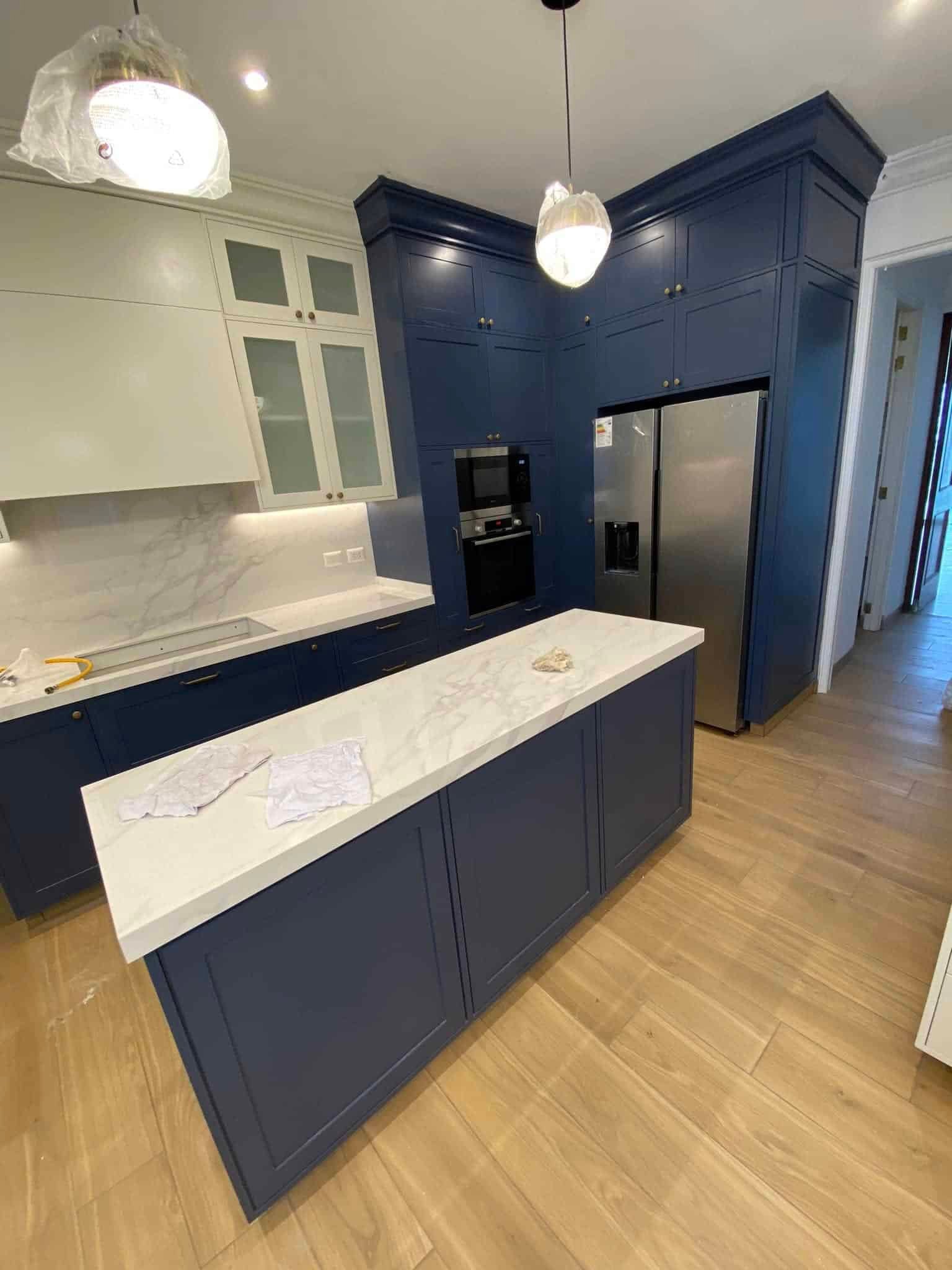Diseño en L con isla, gabinete alto y material resistente a humedad y calor.